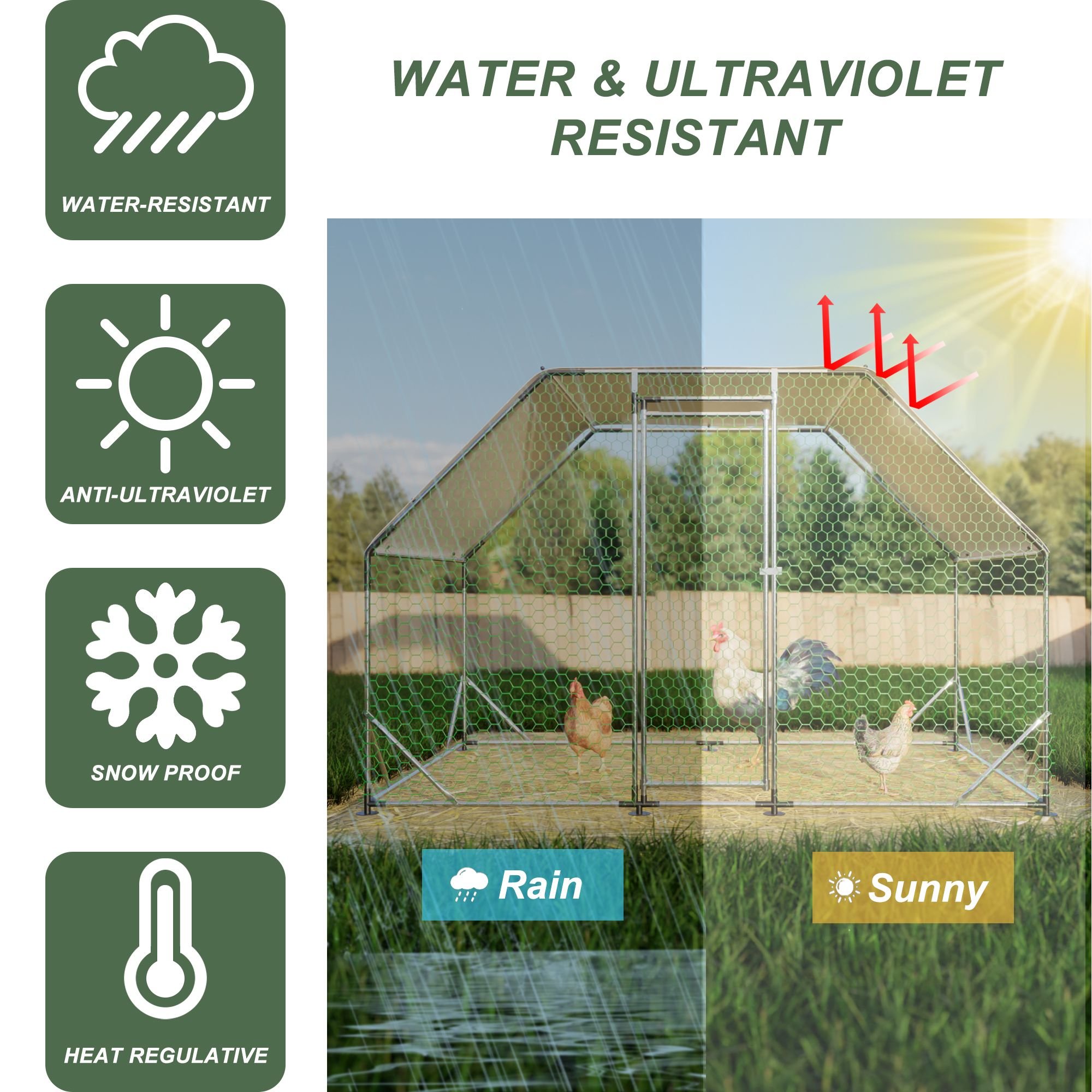 DescriptionThis heavy-duty chicken coop provides a large, comfortable, and safe space for your pets, whether they are chickens, ducks, rabbits or cats, dogs, or bamboo rats. Built with robust steel tubes, an extra thick tarp, and durable wire mesh, this chicken run is an ideal setting for raising animals all year round. The galvanized steel pipe used to construct the chicken cage greatly improves the rust resistance of the cage, giving it a longer life than other products. The walls of the chicken cage are made of PVC-coated hexagonal metal mesh, which is strong and durable, and not easily damaged. The chicken coop tarp is removable, so you can have the option of letting the animals enjoy the warmth of the sun as well as avoiding rain, snow, and excessive UV rays. Don't hesitate, this sturdy and durable chicken cage will become your animals' new favorite place!
