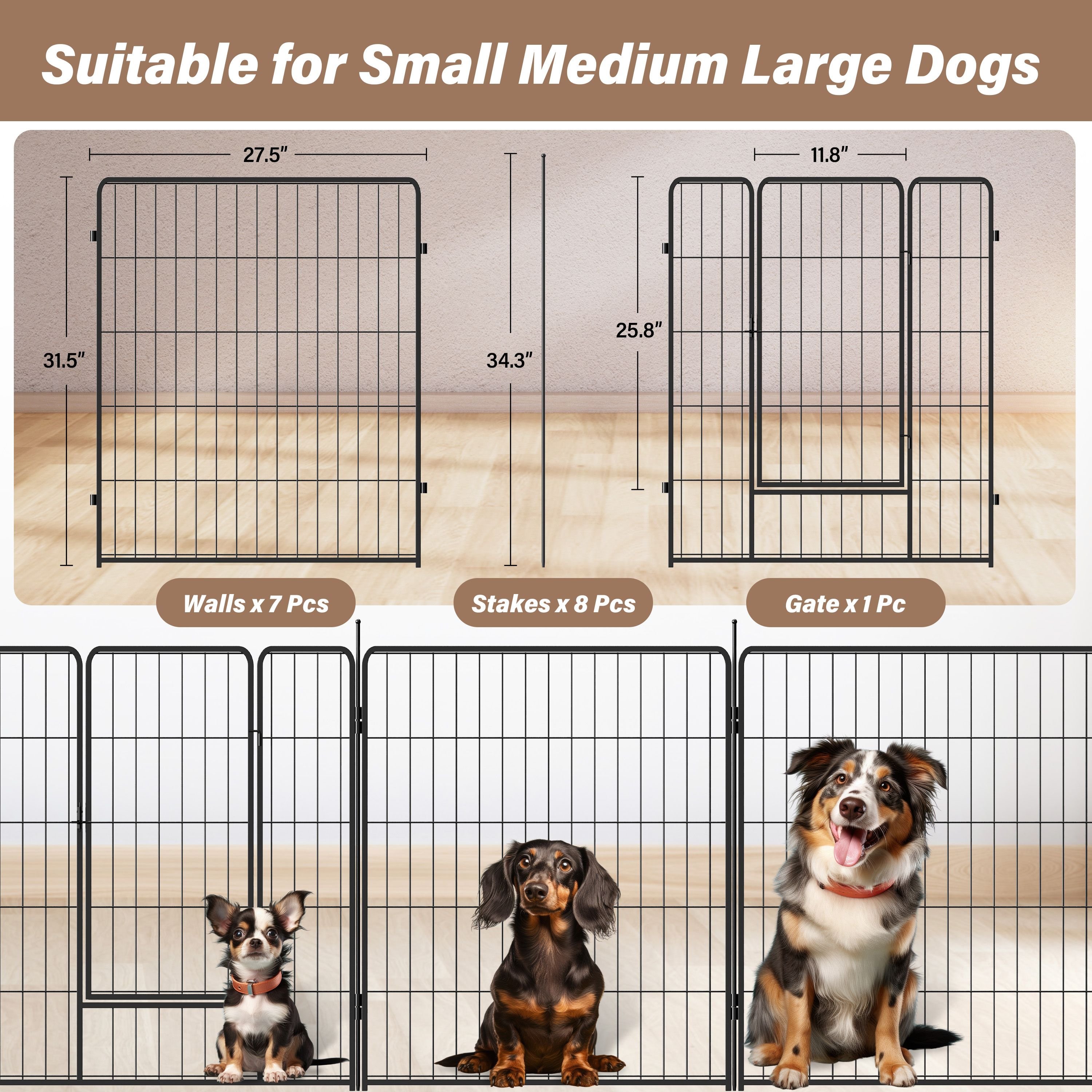 [Iron Fence] The 8 panel dog playpen indoor fence for dogs is made of iron with black anti-rust coating. The metal playpen is free-standing, however, if you have a naughty puppy, you might secure the playpen to the ground firmly for double safety.