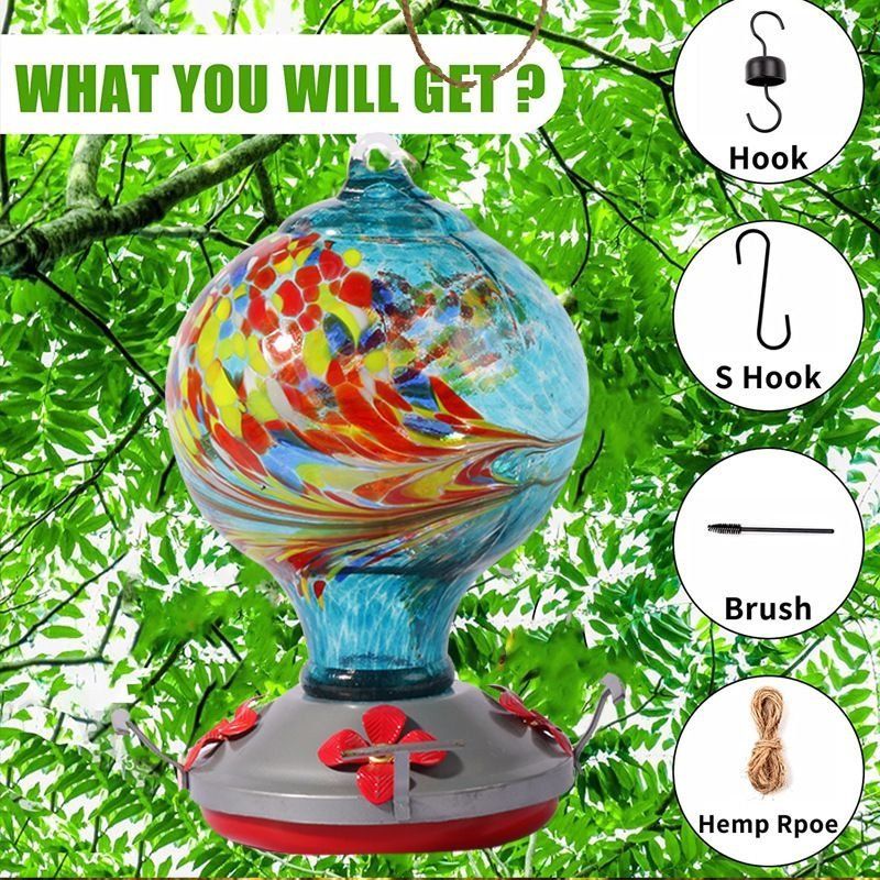 THE ARTWORK THAT HUMMINGBIRDS DART INTO -  our hummingbird feeder comes in the distinctive flower bud shape with spiral grooves; which radiates the charm of curves and adds a great elegance to your yard. Mixing the natural beauty and modern arts; the bright colors flare on the crystal glass body will be equally attractive for human and hummingbirds to help you spend more time watching the birds rather than looking for them.