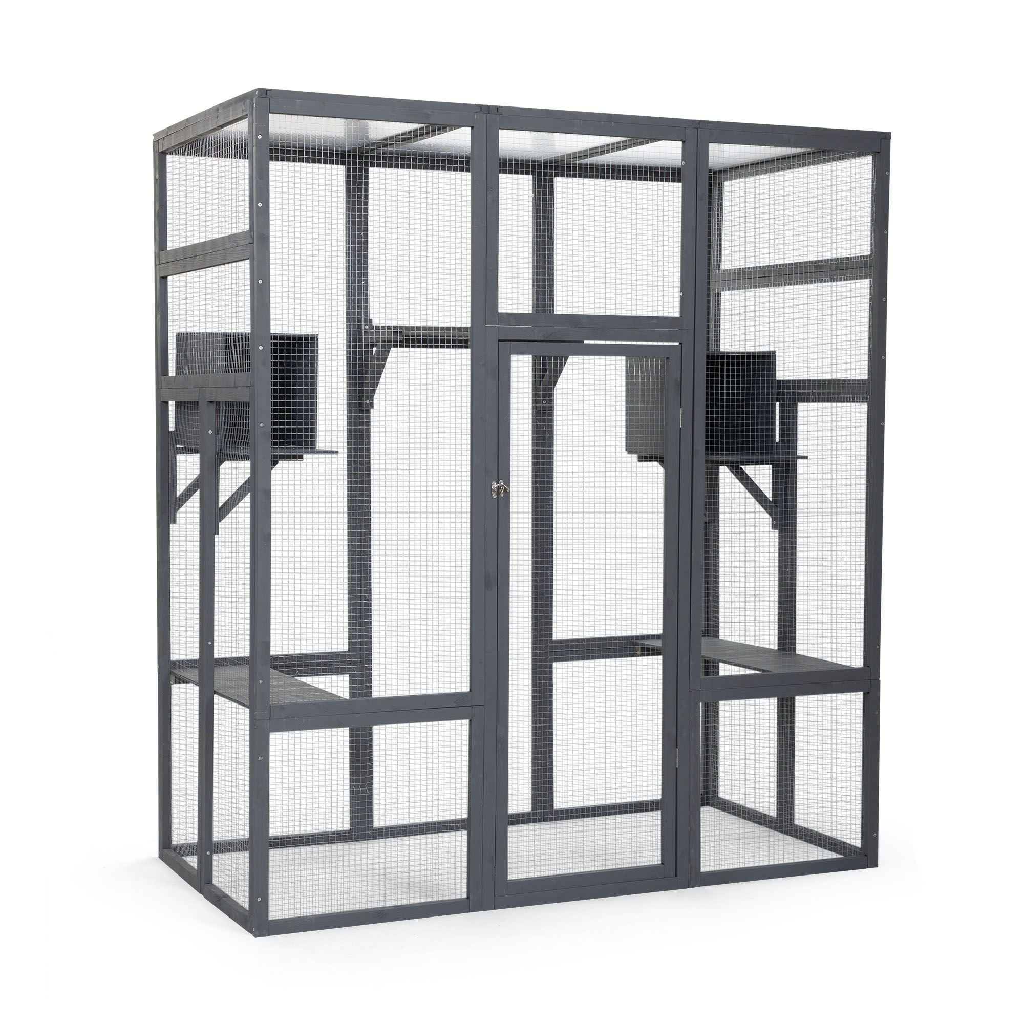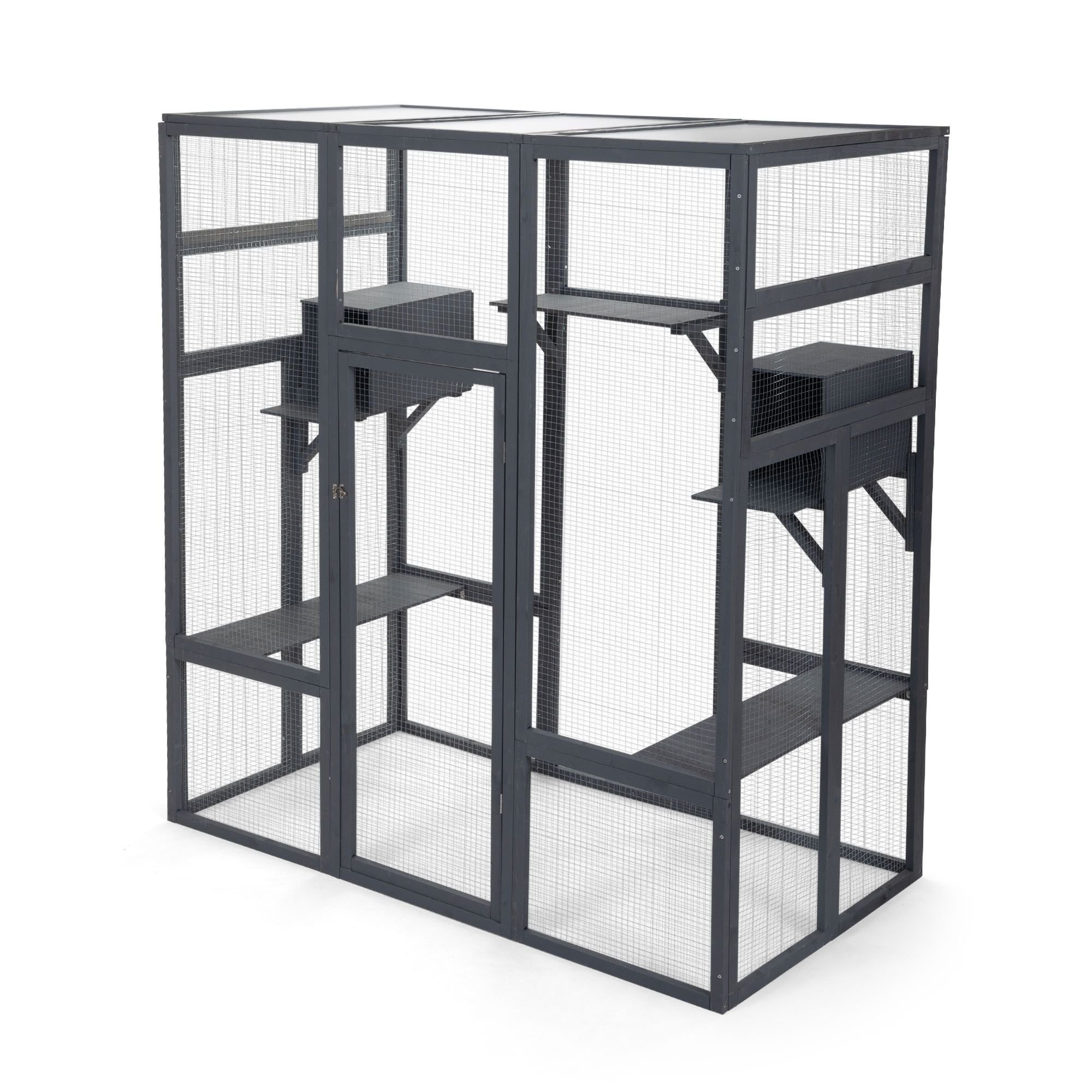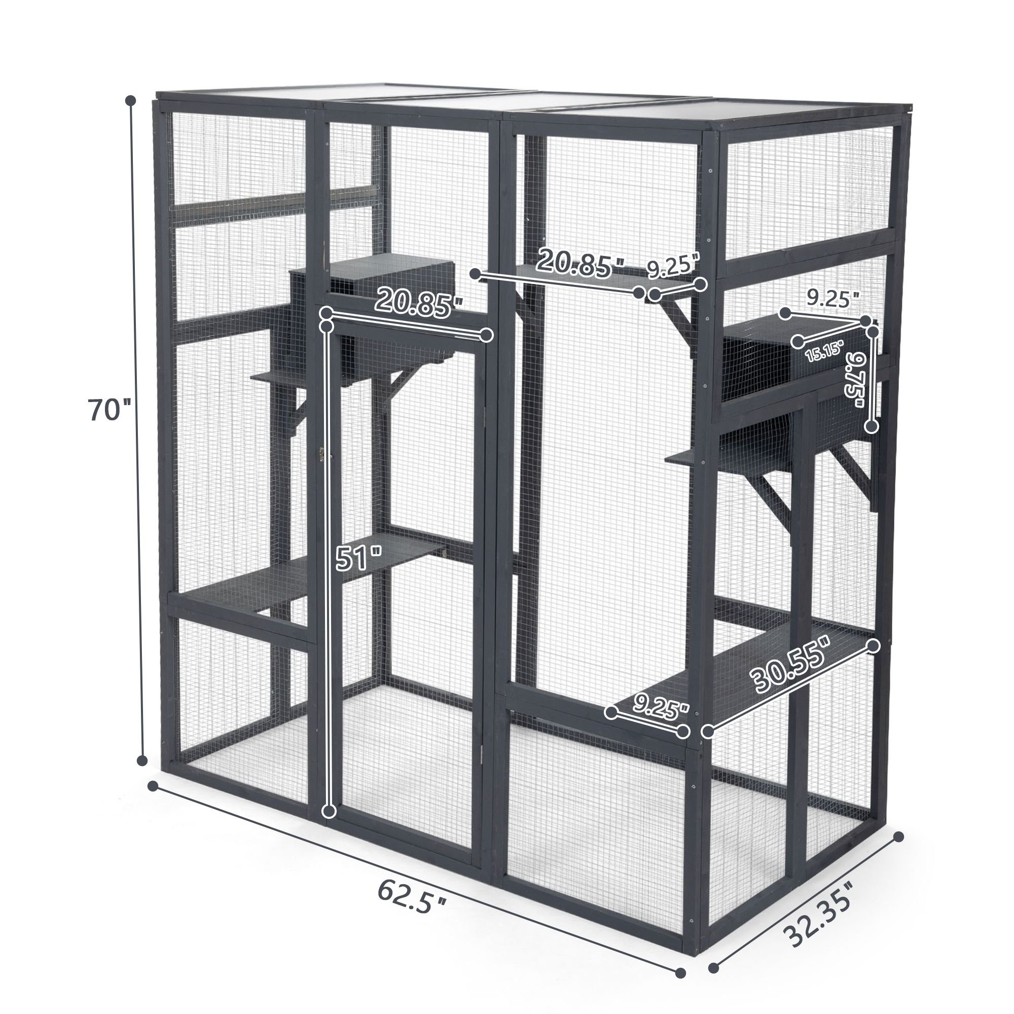 Specifications:Color: GrayMaterial: Fir+Galvanized Net+Polycarbonate PanelOverall Dimensions: 62.4"L x 32.4"W x 70.1"HWooden Frame Dimensions: 51.2"L x 20.9"W (x5); 20.9"L x 18.1"W (x6); 45.3"L x 15.4"W (x4); 30.7"L x 12"W (x4)Door (with Door Frame) Dimensions: 51.2"L x 20.9"WCat Perch Dimensions: 30.6"L x 9.3"W x 0.4"H (Left and Right); 20.9"L x 9.3"W x 0.4"H (Middle)Cat Condo Dimensions: 15.2"L x 9.3"W x 0.4"HTriangle Supporter Dimensions: 9.7"L x 9.7"W x 13.6"HPolycarbonate Panel Dimensions: 19.3"L x 30.7"W x 0.3"HNet Weight: 72.8 lbs