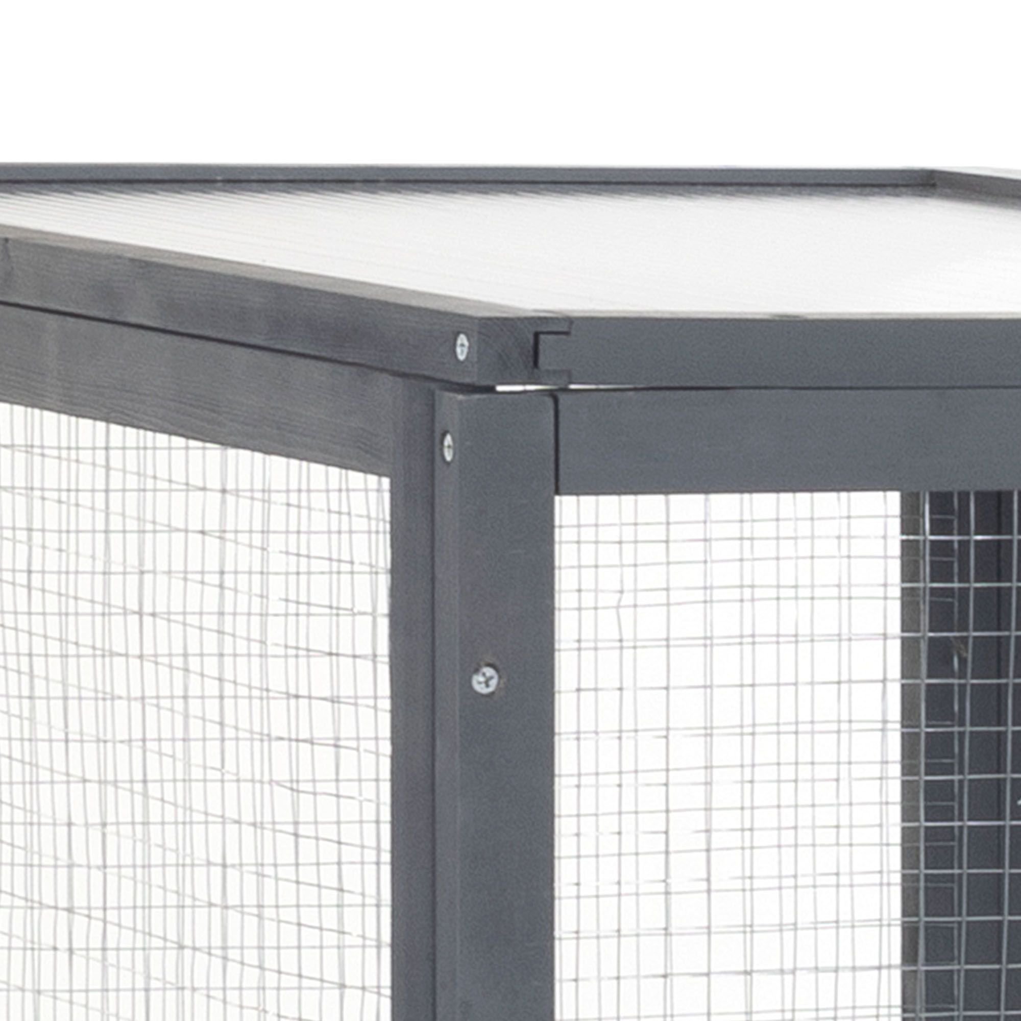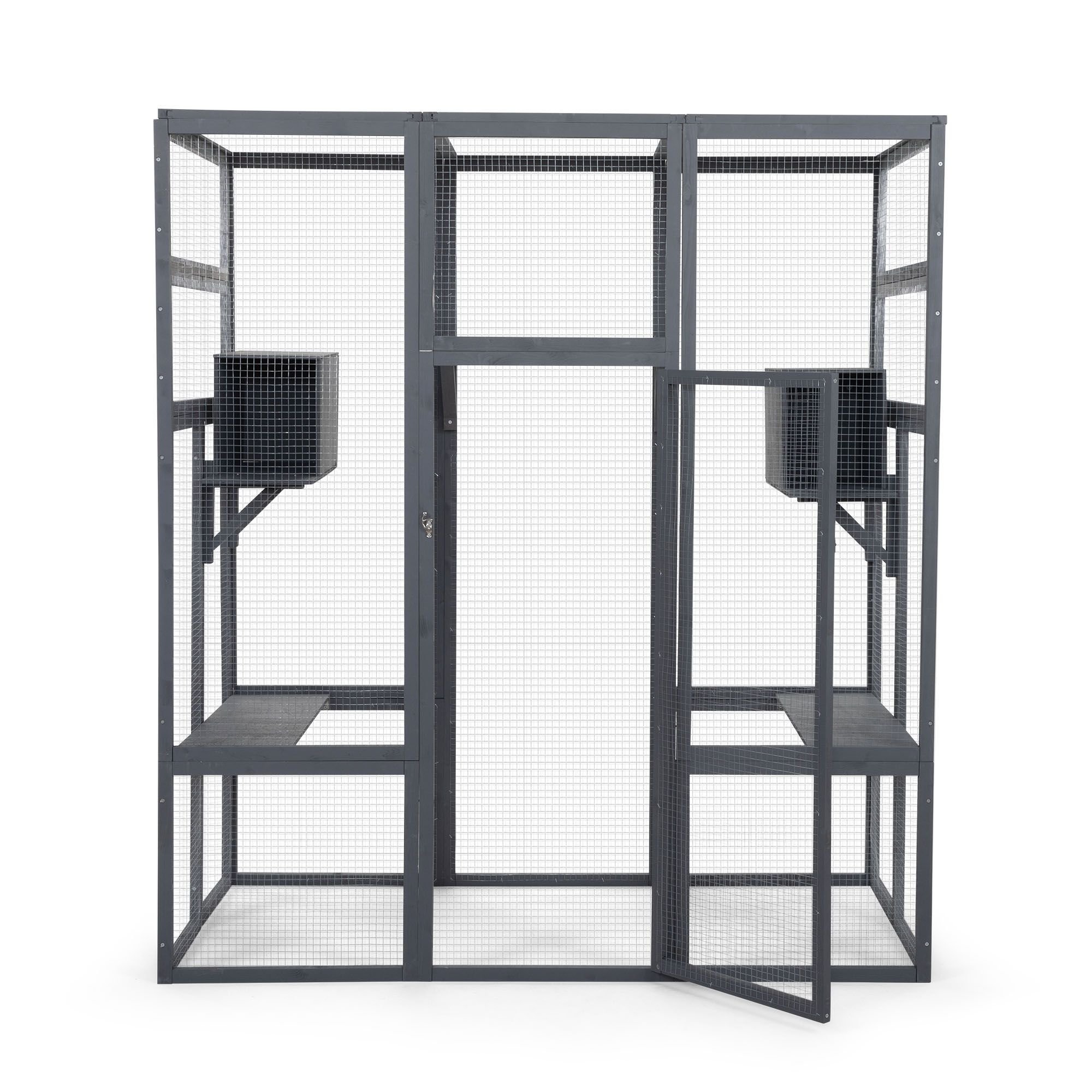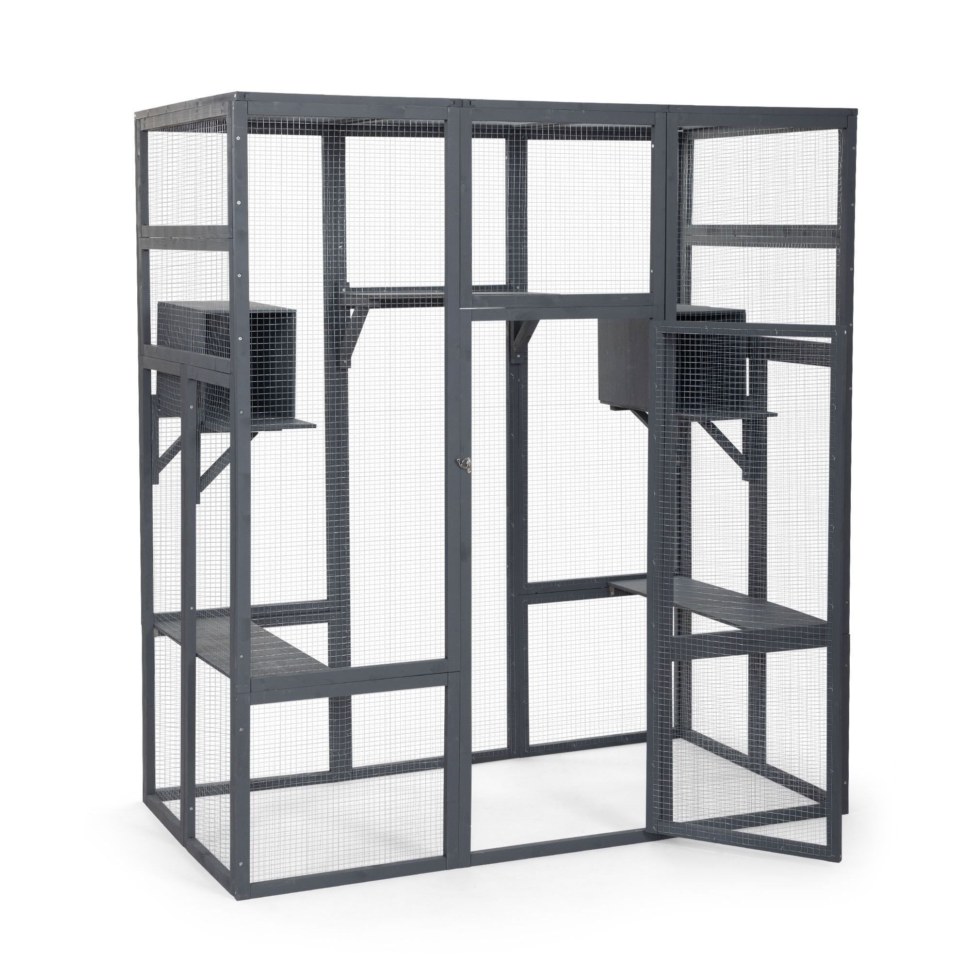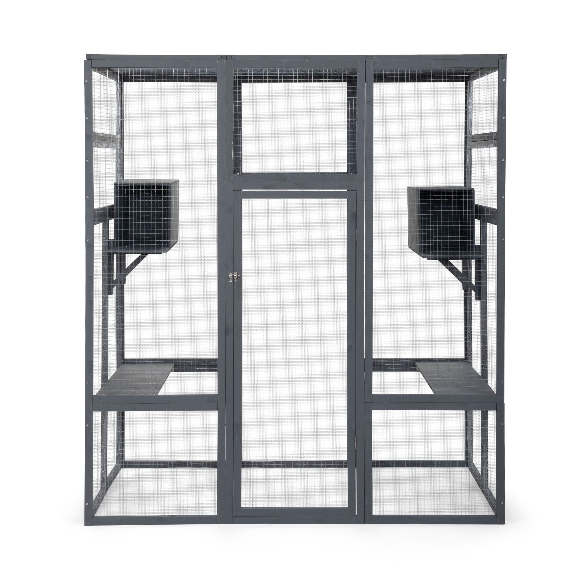 Specifications:Color: GrayMaterial: Fir+Galvanized Net+Polycarbonate PanelOverall Dimensions: 62.4"L x 32.4"W x 70.1"HWooden Frame Dimensions: 51.2"L x 20.9"W (x5); 20.9"L x 18.1"W (x6); 45.3"L x 15.4"W (x4); 30.7"L x 12"W (x4)Door (with Door Frame) Dimensions: 51.2"L x 20.9"WCat Perch Dimensions: 30.6"L x 9.3"W x 0.4"H (Left and Right); 20.9"L x 9.3"W x 0.4"H (Middle)Cat Condo Dimensions: 15.2"L x 9.3"W x 0.4"HTriangle Supporter Dimensions: 9.7"L x 9.7"W x 13.6"HPolycarbonate Panel Dimensions: 19.3"L x 30.7"W x 0.3"HNet Weight: 72.8 lbs